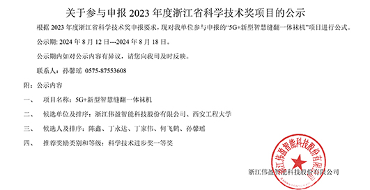 根據(jù) 2023 年度浙江省科學技術獎申報要求,現(xiàn)對我單位參與申報的“5G+新型智慧縫翻一體襪機”項目進行公式。